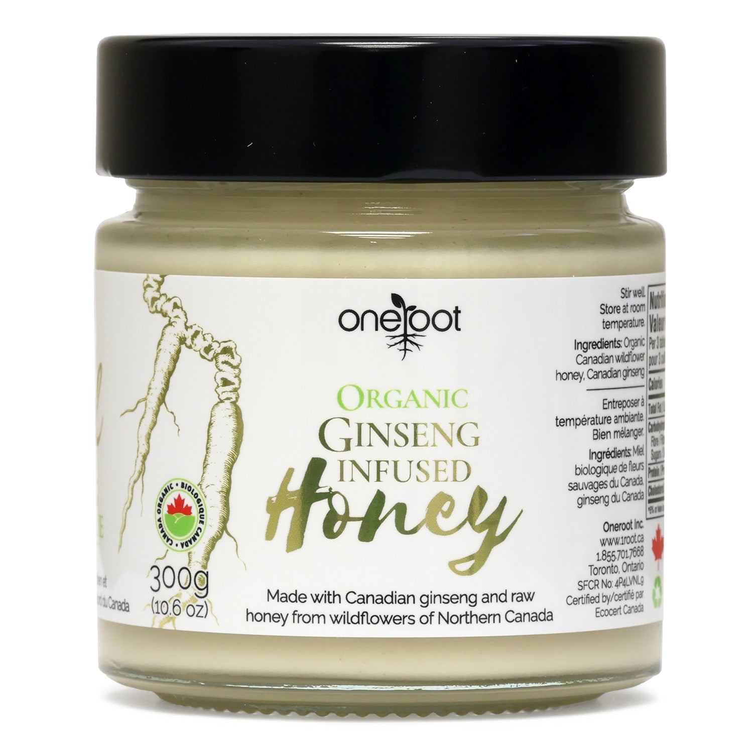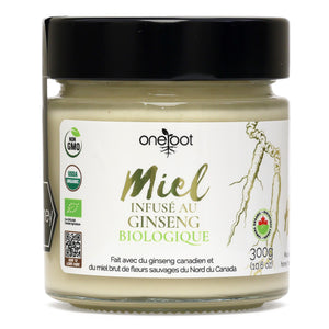 Oneroot Organic Ginseng Honey est fabriqué avec du ginseng canadien biologique et notre miel de fleurs sauvages biologique du nord du Canada.